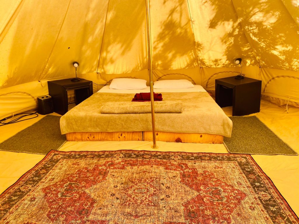 Spacious glamping tents (5m x 5m) will be set up with a double bed, bedside tables, lights, duvet, linen, and pillows. Each tent will have electricity (TBD: we’re working on this!) and a carpet, and is conveniently close to outdoor showers with ablutions. Ten of the tents will be by the main house, the rest in the amphitheatre.