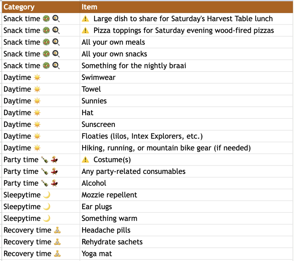 In the spirit of community, we’ll do a harvest table for lunch on Saturday, so you will be asked to please bring a large dish to add to the feast. We will share suggested plates in the event’s WhatsApp group closer to the time.